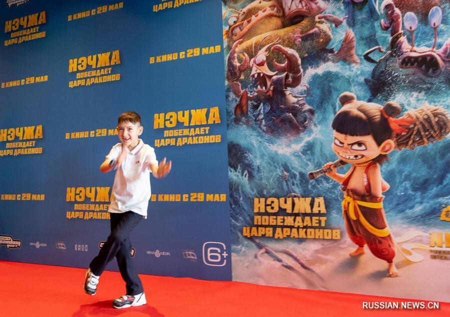 25 мая 2025 года, мальчик позирует для фотографии перед плакатом фильма "Нэчжа 2" после его премьеры для СМИ в Москве. /Фото: Синьхуа/
