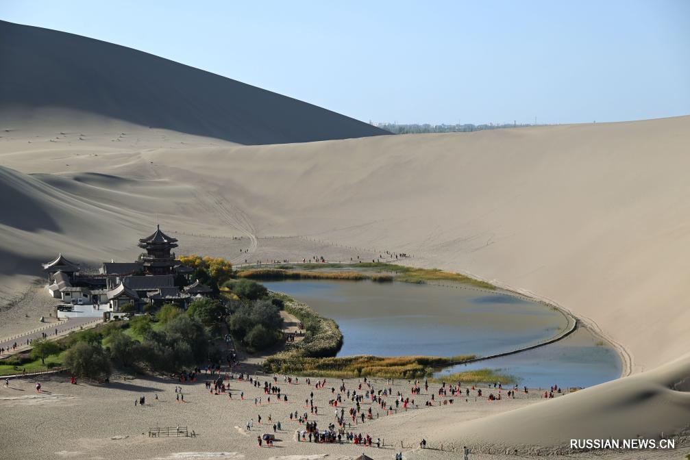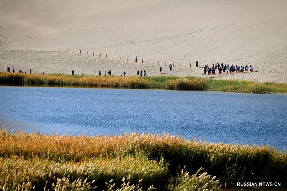 Дуньхуан /пров. Ганьсу/, 13 октября /Синьхуа/ -- Золотой осенью в живописной зоне дюн Миншашань и озера Юэяцюань, расположенной на территории провинции Ганьсу /Северо-Западный Китай/, взору приезжих открываются великолепные по красоте пейзажи. Множество туристов бродят по этому ландшафту, погружаясь в уникальное очарование пустыни.