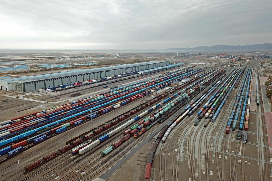 На снимке от 4 ноября 2023 года запечатлены стоящие на КПП Алашанькоу /Северо-Западный Китай/ готовые к отправке грузовые поезда. /Фото: Синьхуа/