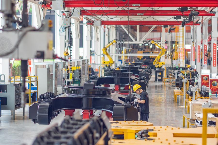 21 апреля 2025 года, сотрудники работают на сборочной линии экскаваторов для экспорта в Лаос и Мьянму на предприятии по производству оборудования в г. Чунцин /Юго-Западный Китай/. /Фото: Синьхуа/