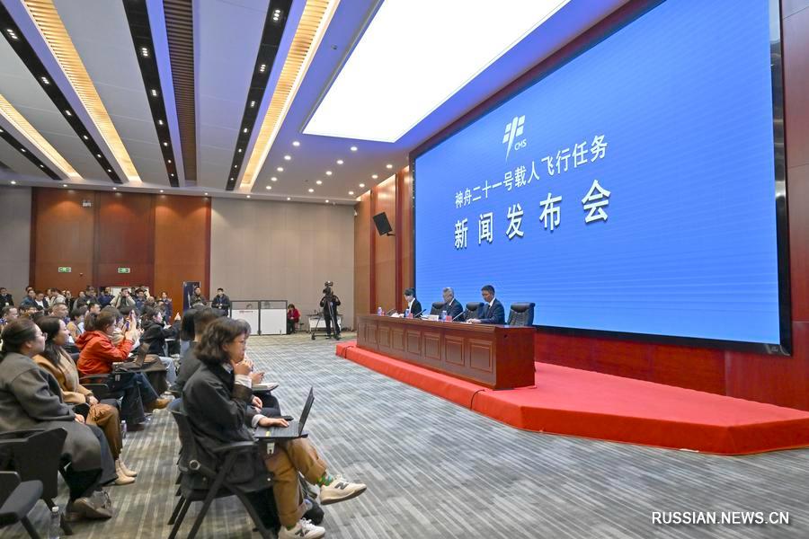 30 октября 2025 года, в Цзюцюане на северо-западе Китая состоялась пресс-конференция, посвященная пилотируемой космической миссии "Шэньчжоу-21". /Фото: Синьхуа/