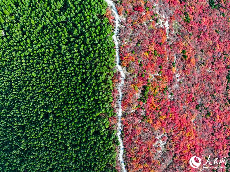 3 ноября, «Жэньминь жибао» онлайн -- В разгар осени гора Сецзышань в городе Цзинань /провинция Шаньдун, Восточный Китай/ удивляет туристов контрастным пейзажем. Горный хребет делит Сецзышань на два склона: северный покрыт вечнозелеными соснами и кипарисами, а южный – зарослями скумпии кожевенной, листья которой осенью становятся насыщенно-красными. Этот контраст создает впечатляющую картину, когда одна гора словно раскрашена в два разных цвета.