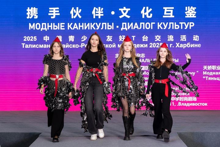 27 октября 2025 года, российские подростки дефилируют по подиуму во время совместного показа мод китайской и российской молодежи 2025 года в городе Харбин провинции Хэйлунцзян /Северо-Восточный Китай/. /Фото предоставлено журналом "Партнеры"/