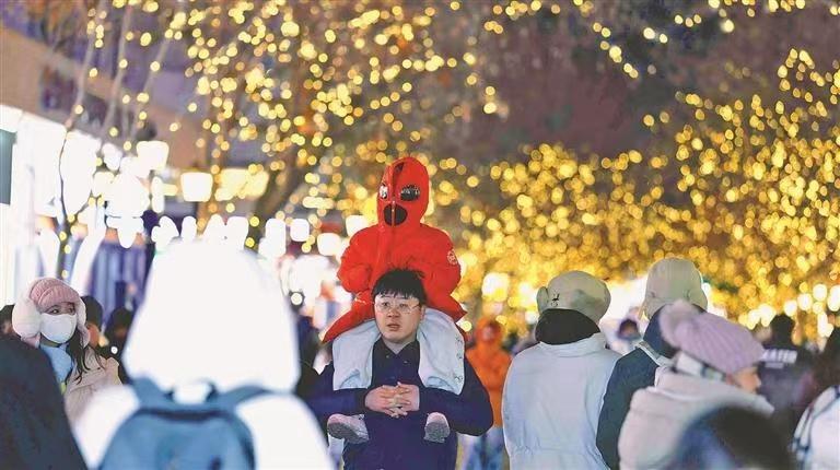 夜幕降临,哈尔滨市中央大街悄然披上了一袭由光影精心织就的梦幻霓裳。游客不同方言的赞叹声此起彼伏,交织在浪漫的氛围中,共同奏响一曲迎接新春的欢快乐章。