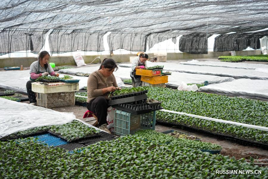 28 января 2026 года, в поселке Яньдянь уезда Шэньсянь местные жительницы проводят работы по прививке рассады овощных культур в теплицах. /Фото: Синьхуа/