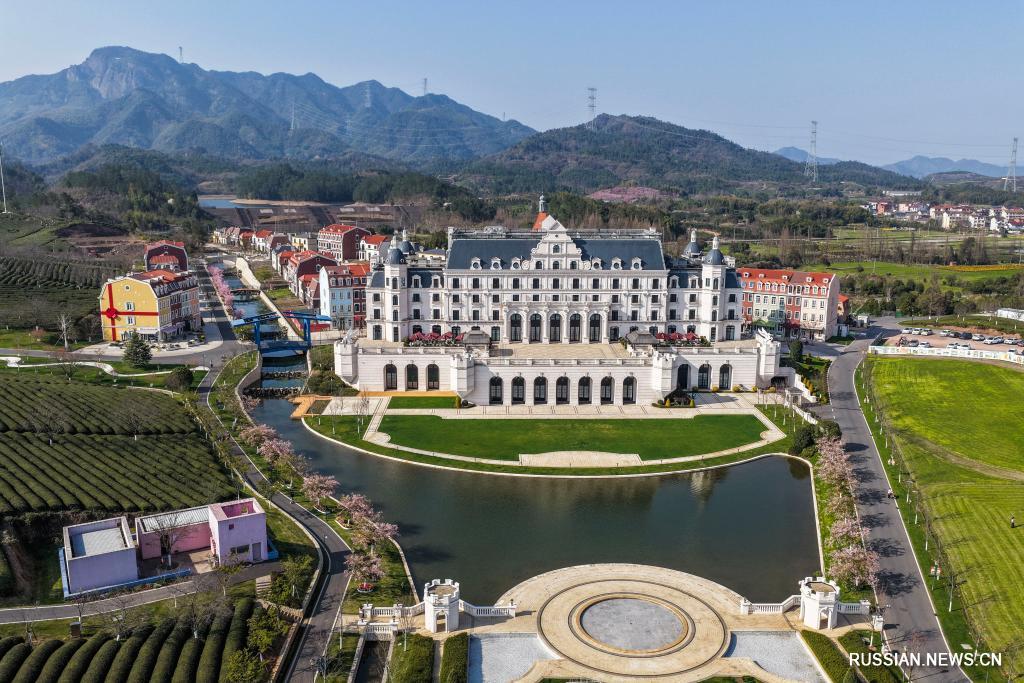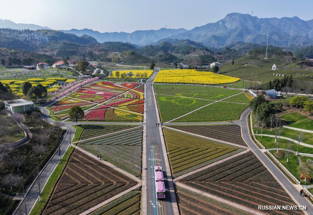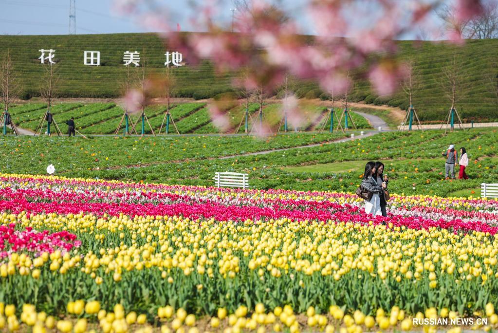 Цзиньхуа, 11 марта /Синьхуа/ -- Светло-желтый рапс, розовая сакура и разноцветные тюльпаны, выделяясь среди весенних цветов, стали украшением живописного района "Хуатянь мэйди" -- объекта сельского туризма в городском округе Цзиньхуа /провинция Чжэцзян, Восточный Китай/, особенно привлекающего посетителей весной.