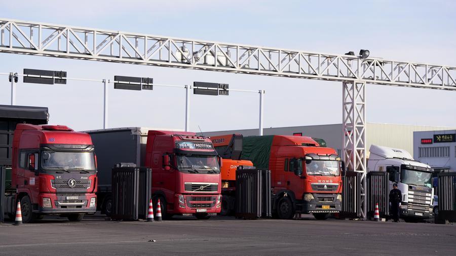 10 февраля 2026 года, грузовики готовятся к выезду из автодорожного КПП Хоргос Синьцзян-Уйгурского автономного района /Северо-Западный Китай/. /Фото: Синьхуа/