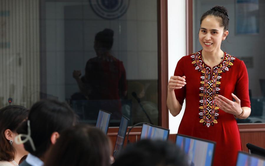 5 мая 2023 года, Джахан Сарыева преподает китайский язык иностранным студентам на международной базе практики китайского языка при институте международного образования Ланьчжоуского транспортного университета. /Фото: Синьхуа/
