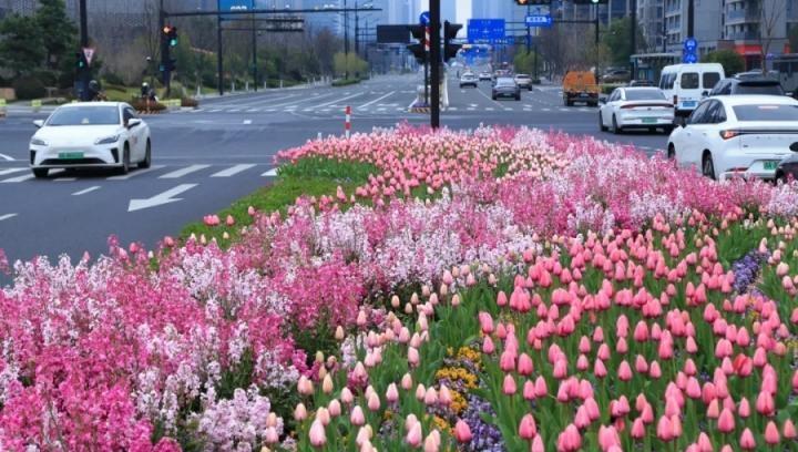 Город Ханчжоу поражает цветами на разделительных полосах